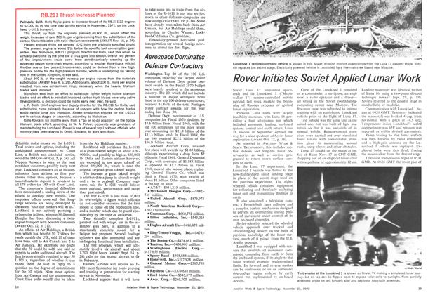 Palmdale, Calif.—Successful first flight of the Lockheed L-1011 trijet was made on its target date of Nov. 17, in spite of a tight flight preparation program stemming primarily from engine modifications. Based on current progress, Lockheed-California Co. and airline customers who viewed the flight here are satisfied that the aircraft will be certificated for service in November, 1971.