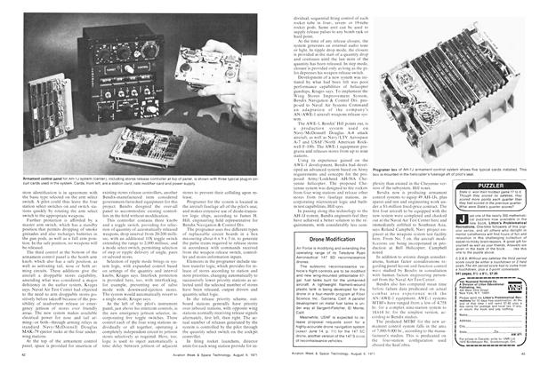 Patuxent River, Md.—Improved armament control system for Marine Corps/Bell AH-1J SeaCobra helicopters applies microcircuit logic programing to enhance weapons systems management, delivery capabilities and flexibility. The new system’s cockpit-mounted controller and remotely-located programer permit Marine Corps pilots to trigger selectively from any or all of four underwing stations a variety of weapons, including almost any combination of pods, launchers or droppable stores used to fulfill the SeaCobra’s missions of landing zone preparation, helicopter escort and fire suppression.