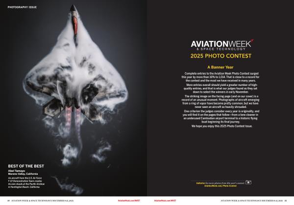 A Banner Year Complete entries to the Aviation Week Photo Contest surged this year by more than 16% to 1,014. That is close to a record for the contest and the most we have received in many years. More entries overall should yield a greater number of high-quality entries, and that is what our judges found as they sat down to select the winners in early November.